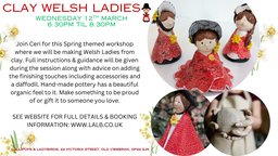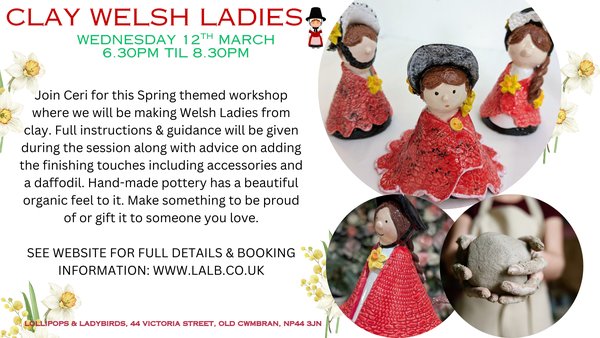 Join Ceri for this Spring themed workshop where we will be making Welsh Ladies from clay. Full instructions & guidance will be given during the session along with advice on adding the finishing touches including accessories and a daffodil. Hand-made pottery has a beautiful organic feel to it. Make something to be proud of or gift it to someone you love.
