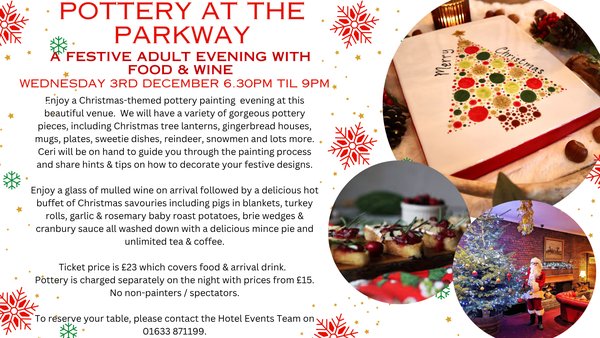 Enjoy a Christmas-themed pottery painting evening at this beautiful venue. We will have a variety of gorgeous pottery pieces, including Christmas tree lanterns, gingerbread houses, mugs, plates, sweetie dishes, reindeer, snowmen and lots more including non-festive options.