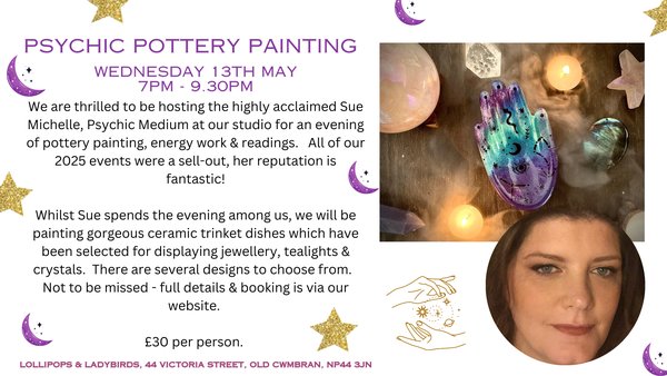 We are thrilled to be hosting the highly acclaimed Sue Michelle, Psychic Medium at our studio for an evening of pottery painting, energy work & readings. All of our 2025 events were a sell-out, her reputation is fantastic!