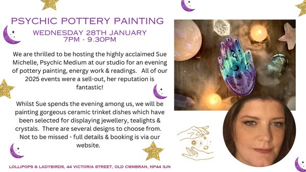 We are thrilled to be hosting the highly acclaimed Sue Michelle, Psychic Medium at our studio for an evening of pottery painting, energy work & readings. All of our 2025 events were a sell-out, her reputation is fantastic!